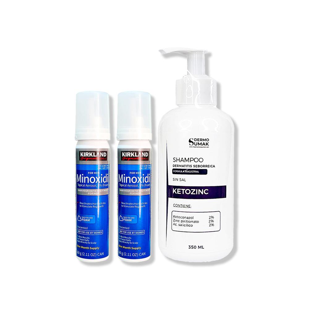 2 Minoxidil Espuma Kirkland + Shampoo Sin Sal Ketozinc Cabello Graso 350ml