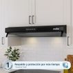 | Características | Frente con visera de cristal. Sistema de extracción por turbina. Sistema de instalación por evacuación o recirculación de aire. Capacidad de extracción: 210 m3/h. Con veleta para una correcta dirección y circulación del aire. Nuevo diseño de control, incluye PushBotton. Luz que brinda mayor visibilidad al momento de cocinar. |