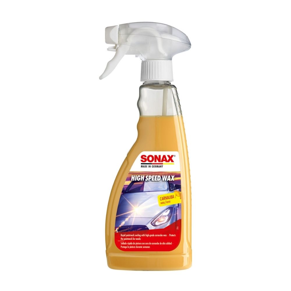 | Recomendaciones de uso | Lavar el vehículo con SONAX Champú brillo y aclarar con agua limpia. No es necesario secar. Agitar bien el frasco antes de usar. Gire la boquilla del pulverizador a la posición de pulverización. Pulverizar High speed wax sobre un paño de microfibra y extender uniformemente sobre la pintura seca o ligeramente húmeda. Trate solo zonas parciales cada vez. Elimine inmediatamente cualquier resto con un paño de microfibra seco. A continuación, tratar la siguiente sección. Si el producto se seca, basta con pulverizar el producto de nuevo y limpiar inmediatamente. |