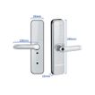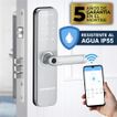 | Características | Apertura con huella, clave, tarjeta, celular de forma remota y llave. Color Plata Resistente al Agua |