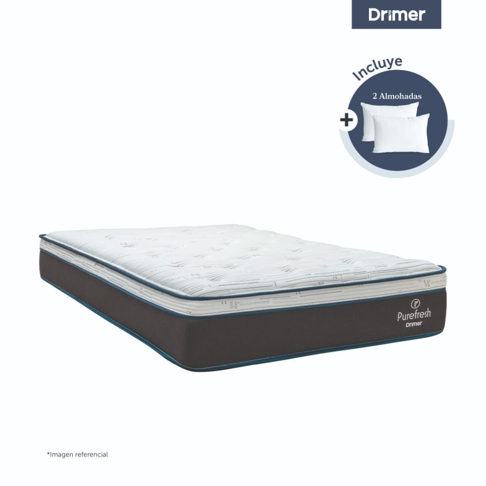 | Beneficios | New Pure Fresh. Pure Fresh ofrece un soporte ideal brindado por el látex europeo acompañado de un panel de resortes Pocket Nested adicionando la suave textura y frescura del tapiz con hilos de bamboo. Dile adiós a los olores con el tratamiento antibacterial Air Fresh. Box Tarima: Base plana con tela antideslizante, estructura de madera y MDF. |