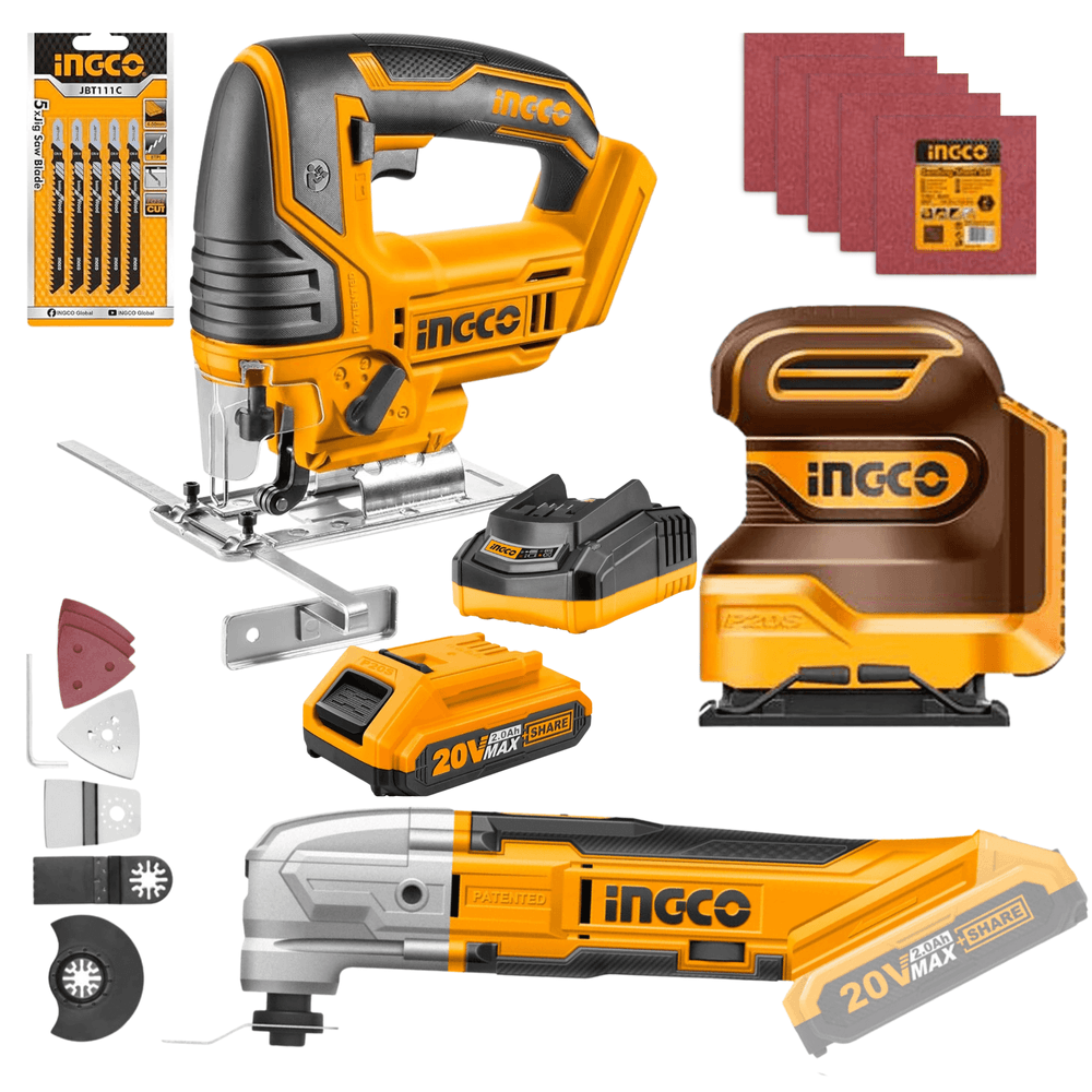 Combo lijadora orbital+ Sierra caladora+ Multifunción 20v Ingco CSHSLI20141-CJSLI8501-CMLI2001