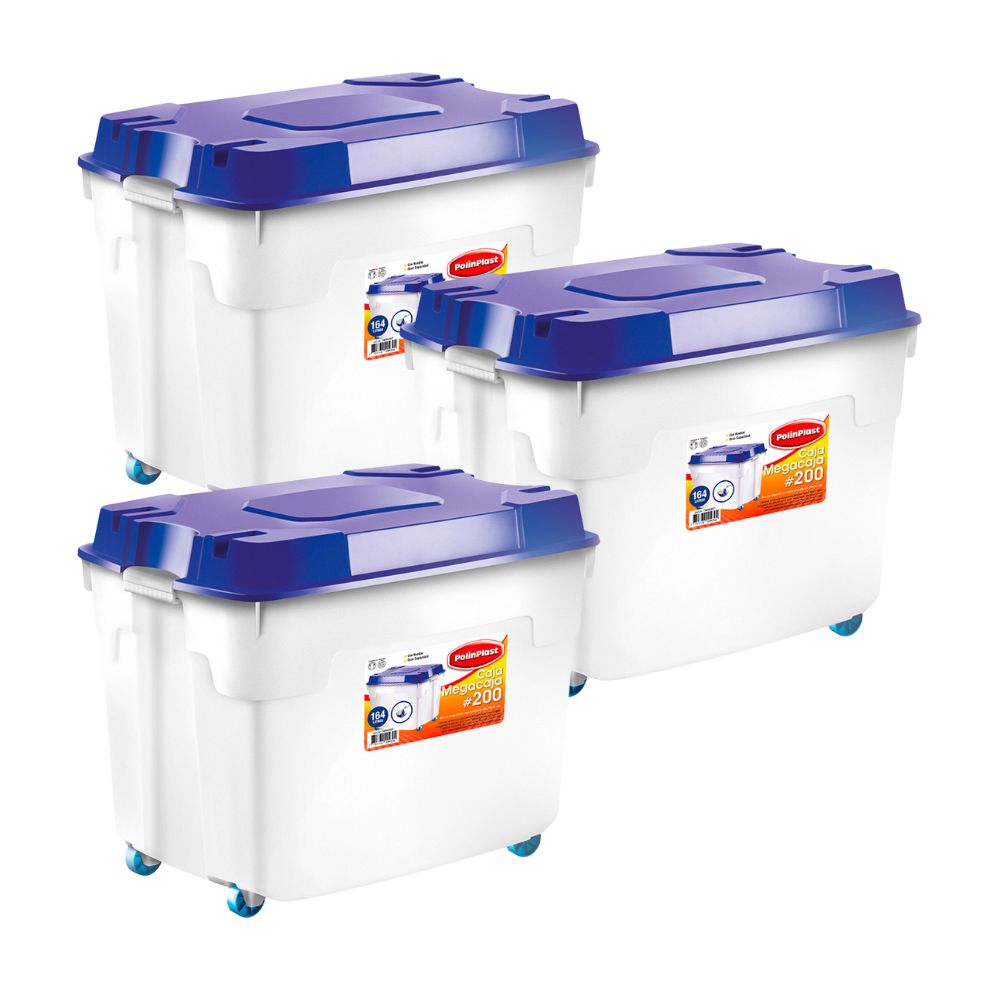 Combo Polinplast: 3 Cajas Organizadora Mega #200 Azul 164 litros con Ruedas