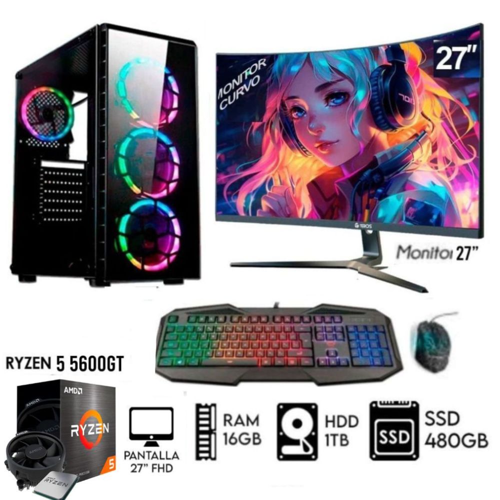 Computadora Pc Gamer RYZEN 5 5600GT Ram16GB Disco HDD 1TB SSD 480GB Monitor 27 FHD