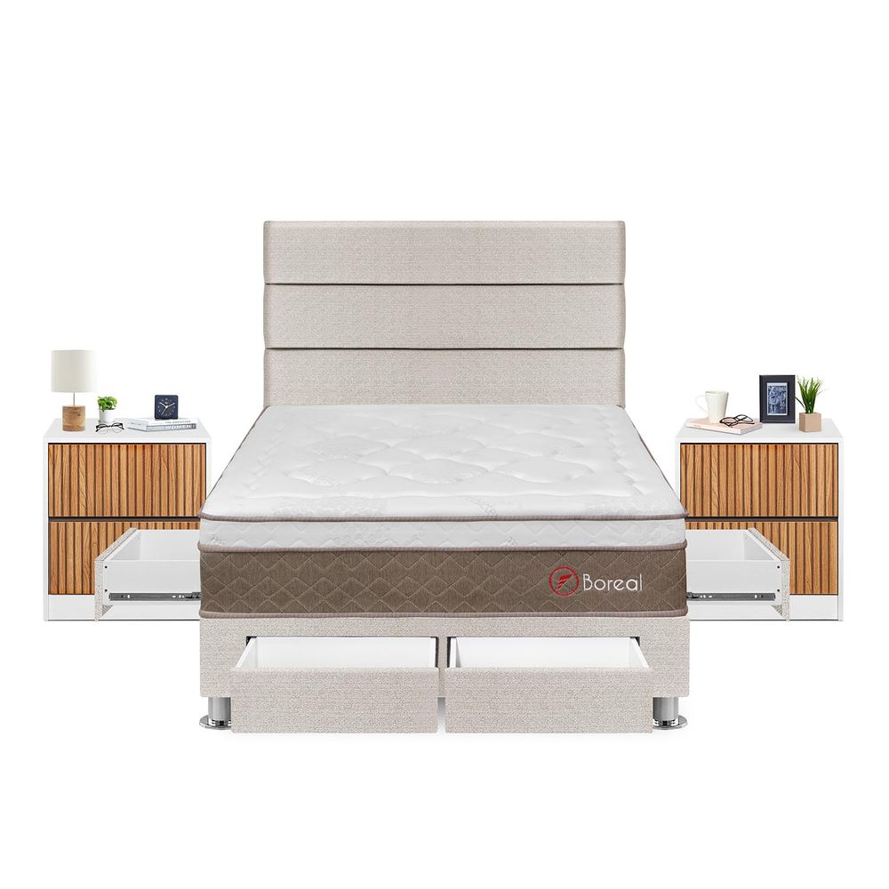 Dormitorio Boreal Con 4 Cajones 2 Plazas + Velador Roma + Respaldo Beige
