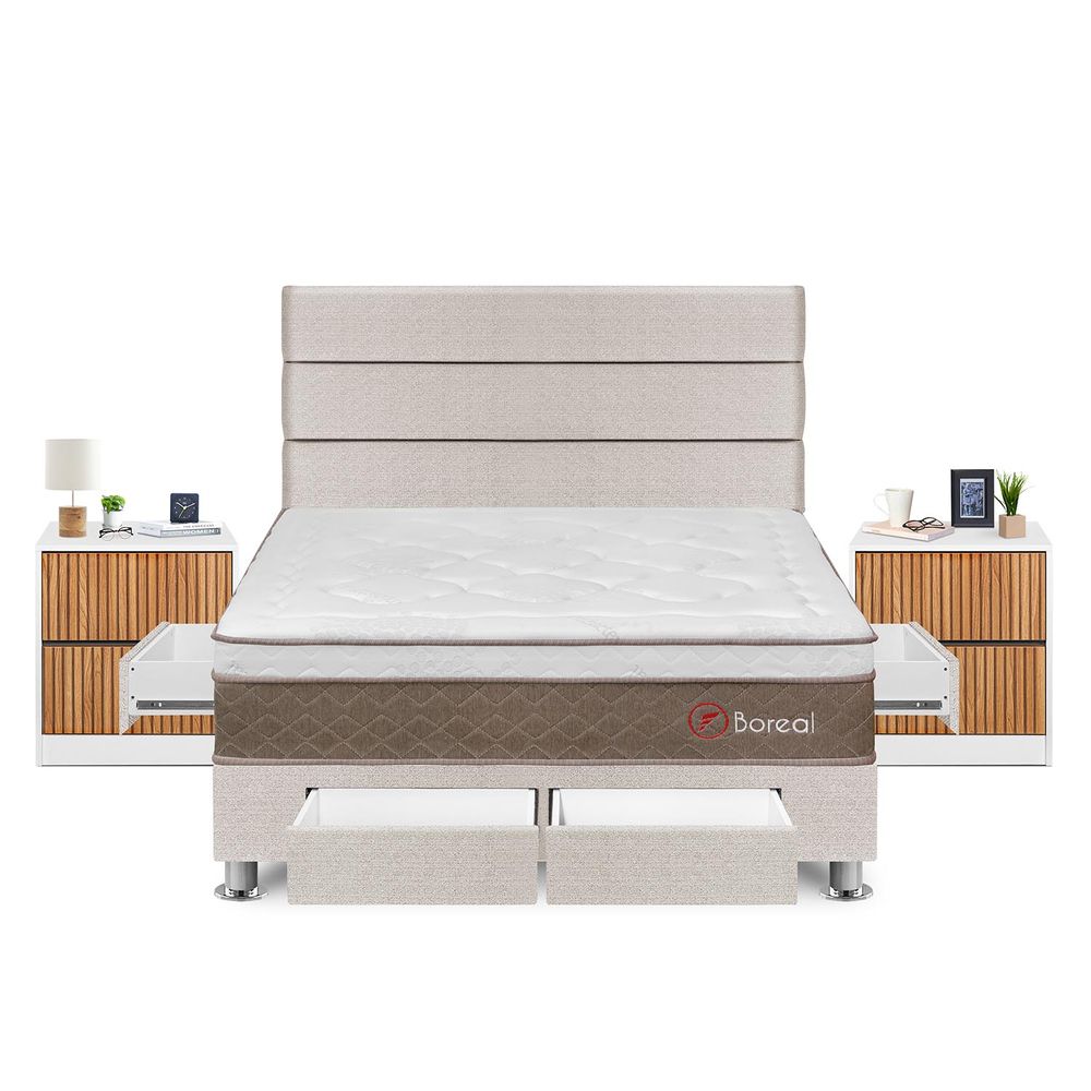 Dormitorio Boreal Con 4 Cajones Queen + Velador Roma + Respaldo Beige
