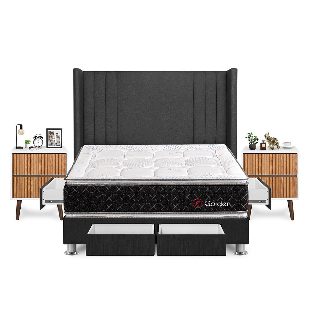 Dormitorio Golden Con 4 Cajones King + Velador Milan + Respaldo Gris