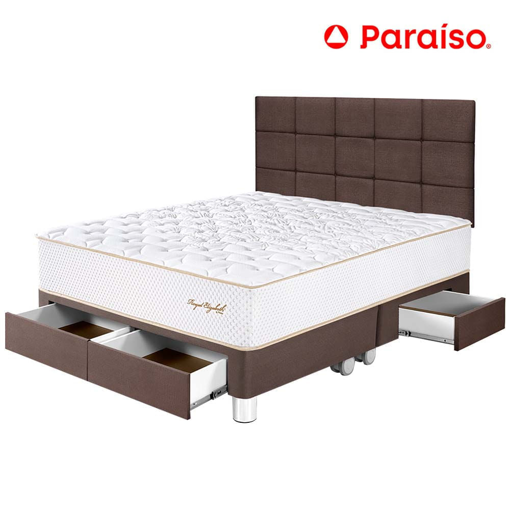 Dormitorio PARAISO Royal Elizabeth C/Cajones Queen + Cabecera Blocks Chocolate + 2 Almohadas + 1 Protector