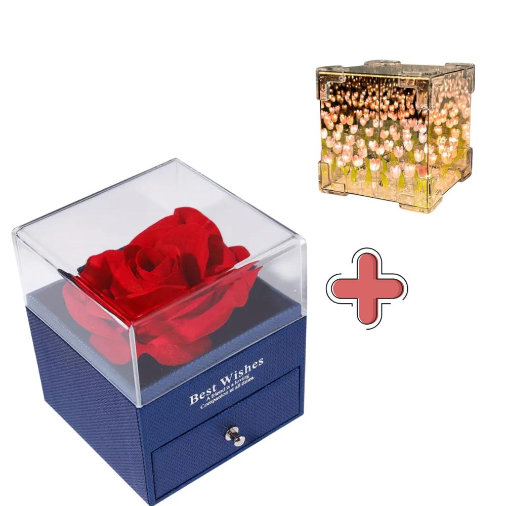 Dúo Perfecto: Rosa Eterna en Cofre y Tulipanes Rosados