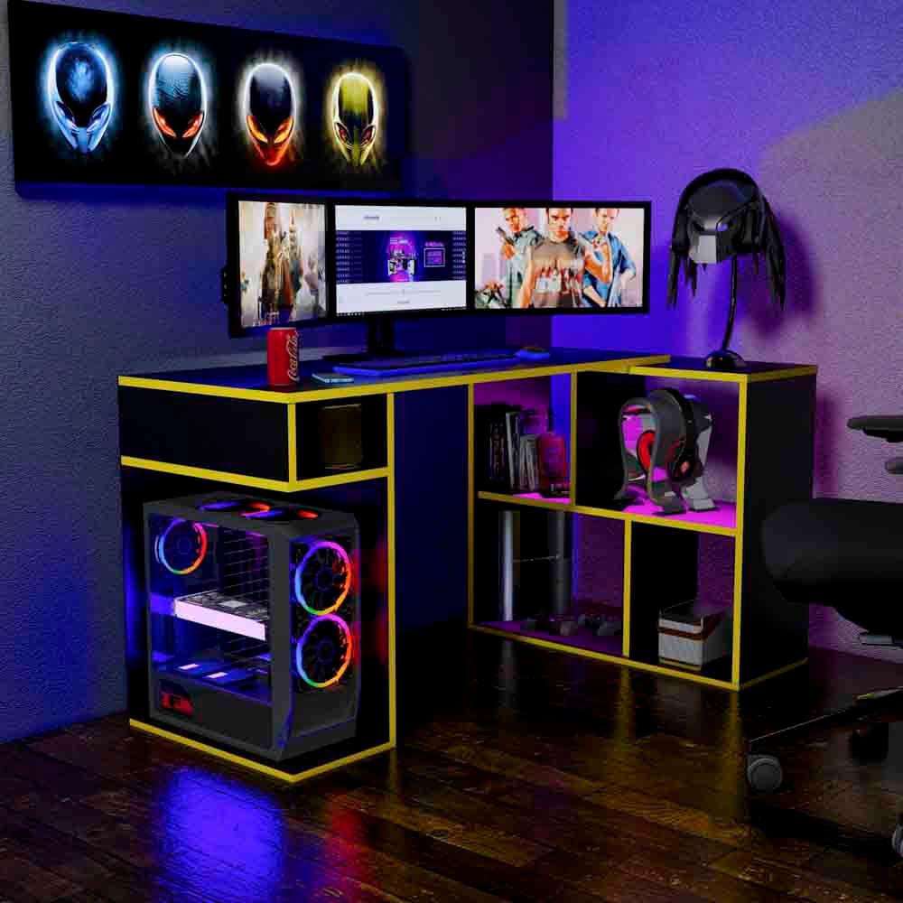 Escritorio Gamer en L NR011 133x80cm Movenda Muebles Negro con Amarillo