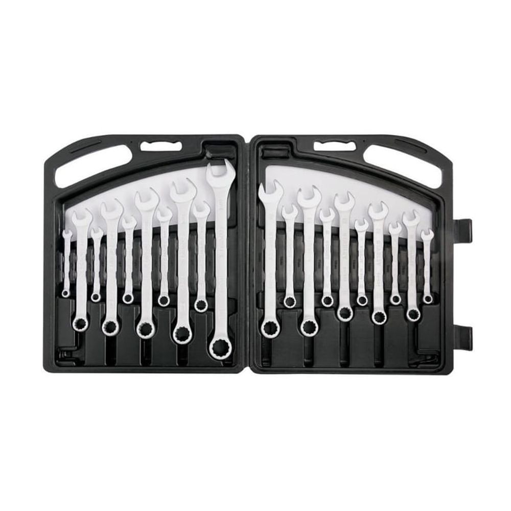 | Incluye | Llaves: 8,9,10,11,12,13,14,15,17 y 18 mm, 1/4", 5/16", 3/8", 7/16", 1/2", 9/16", 5/8", 11/16", 3/4", 7/8" y organizador plástico de transporte. |