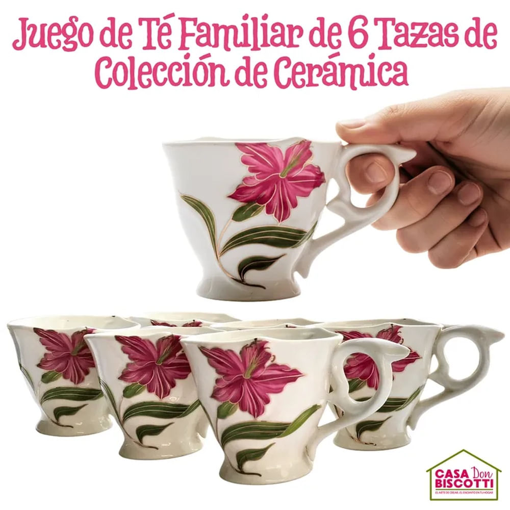 Juego de Té Completo de 6 Tazas Florales Cerámica para Visitas Lonche Blanco con Diseño Floral en Alto Relieve por los 2 lados de la Taza