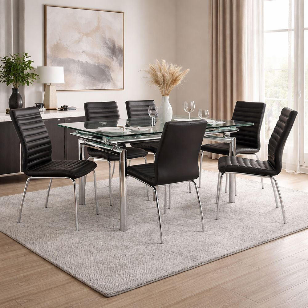 | Material | Mesa: Vidrio templado + Patas de metal Silla: Asiento y respaldo de PU + Espuma + Marco de madera Contrachapada + Patas de metal |