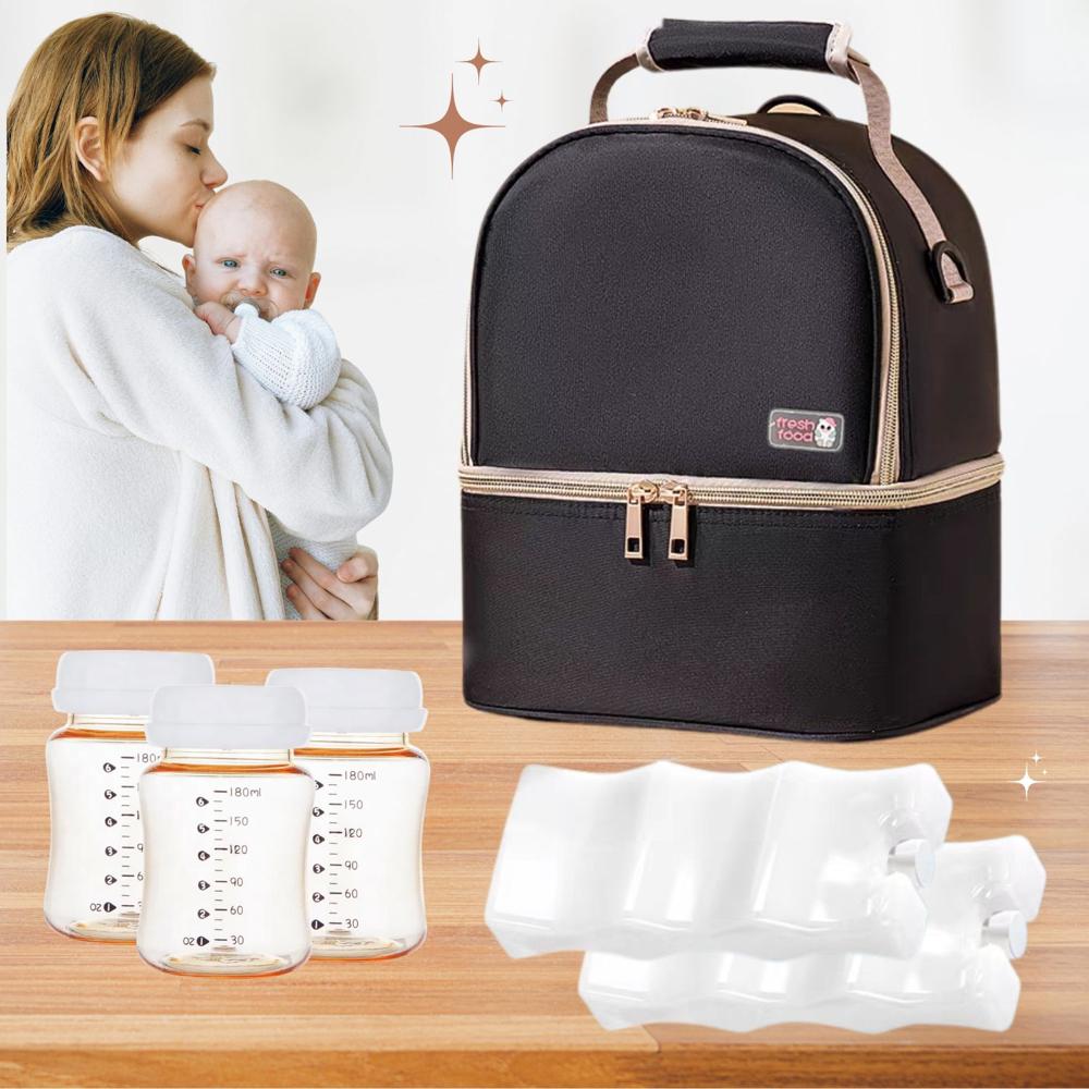 KIT Bolso Cooler Bag Termico Conservador de Leche Negro + 2 Porta Hielo + 3 Botellas PPSU