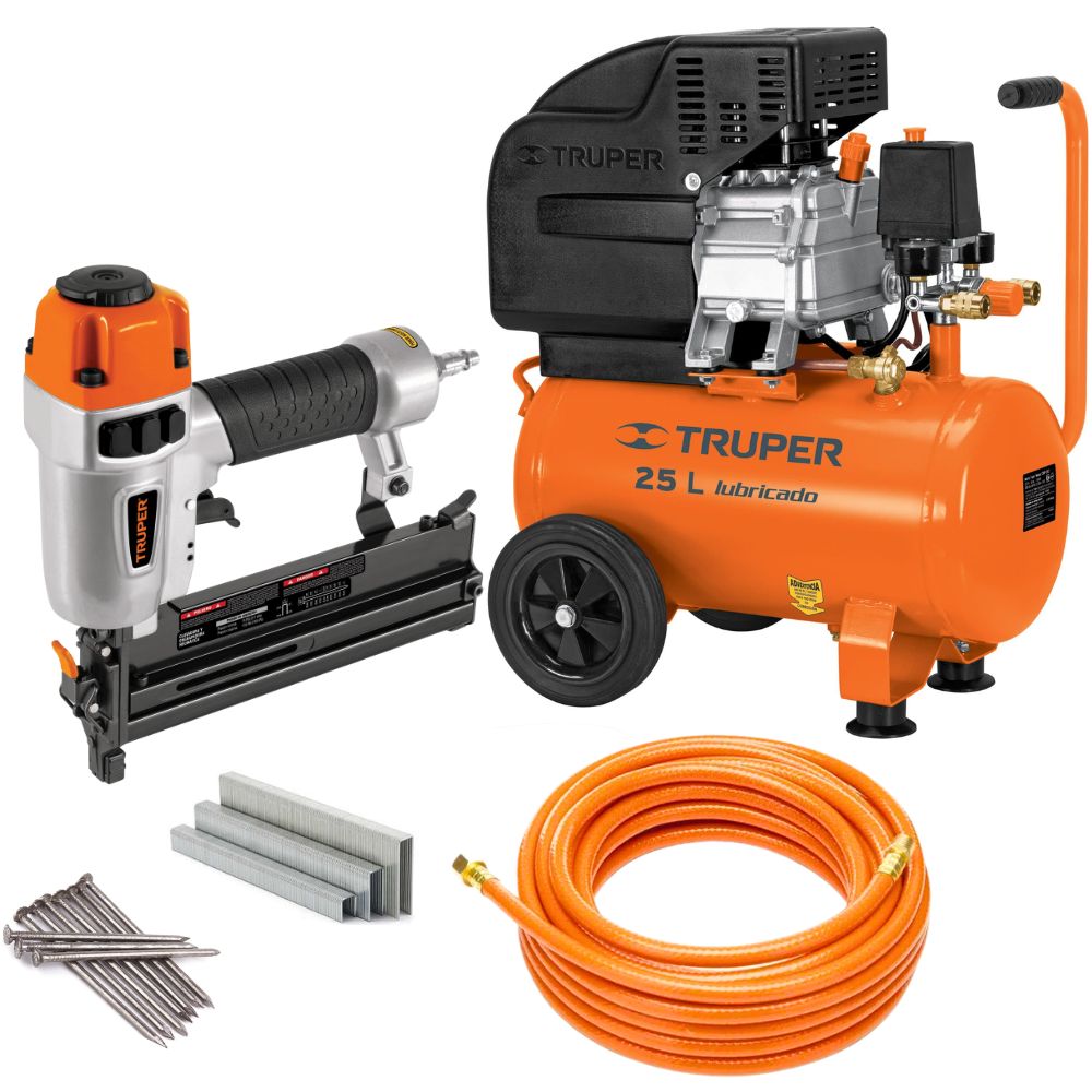 kit Compresor de aire 25L 3HP Clavadora engrapadora 18 manguera 10m