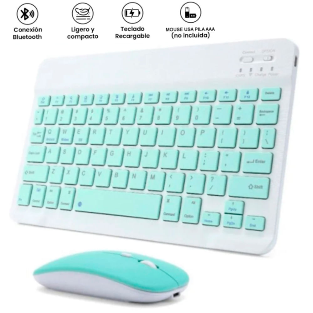 Kit Teclado Y Mouse Bluetooth Recargable Pc Tablet iPad Turquesa