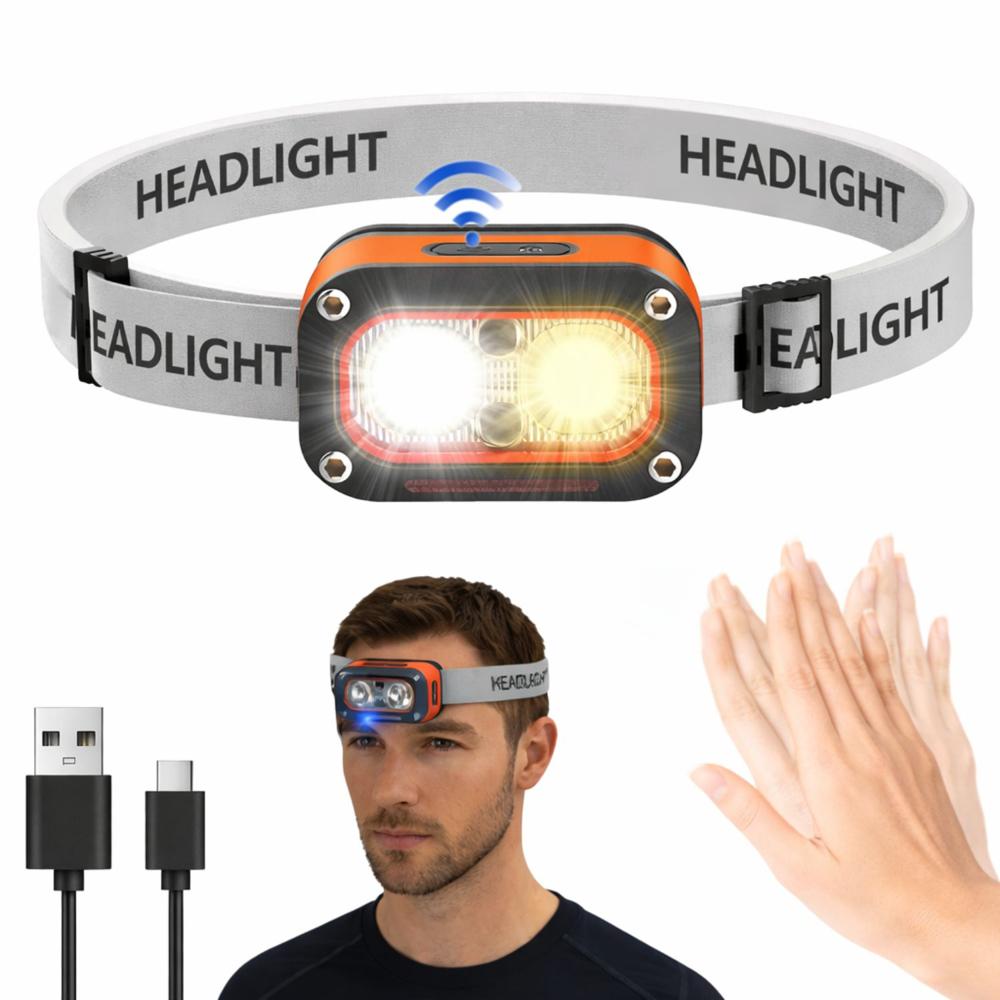 Linterna Frontal Recargable Sensor Movimiento 400LM Luz Blanca Amarilla Roja USB-C Impermeable