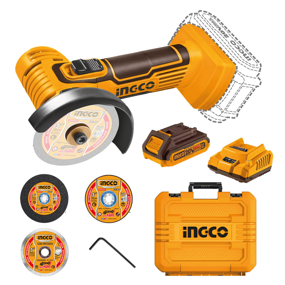 Mini Amoladora Ingco 20V 76MM + Discos + 1 Batería 2.0AH + Cargador CAGLI76012