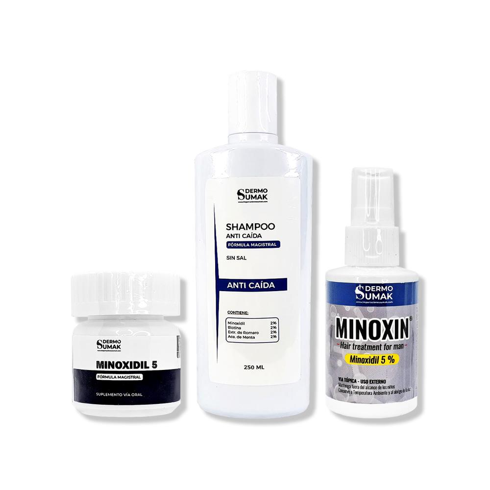 Minoxidil Caps 60 + Shampoo Sin Sal Anticaída 250ml + Locion Minoxin