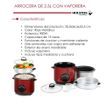 CaracterísticasOlla arrocera hecho de interior de aluminio con revestimiento antiadherente y con placa de calentamiento. Cuenta con cable desmontable para fácil limpieza y almacenamiento, asas anti calor, tapa de vidrio refractario y control térmico automático, hervidora o vaporera externo ubicada en la parte superior de la olla para preparar toda clase de alimentos, funciones de cocción y mantener caliente (Cook y Warm). Voltaje: 220 V - 50 Hz