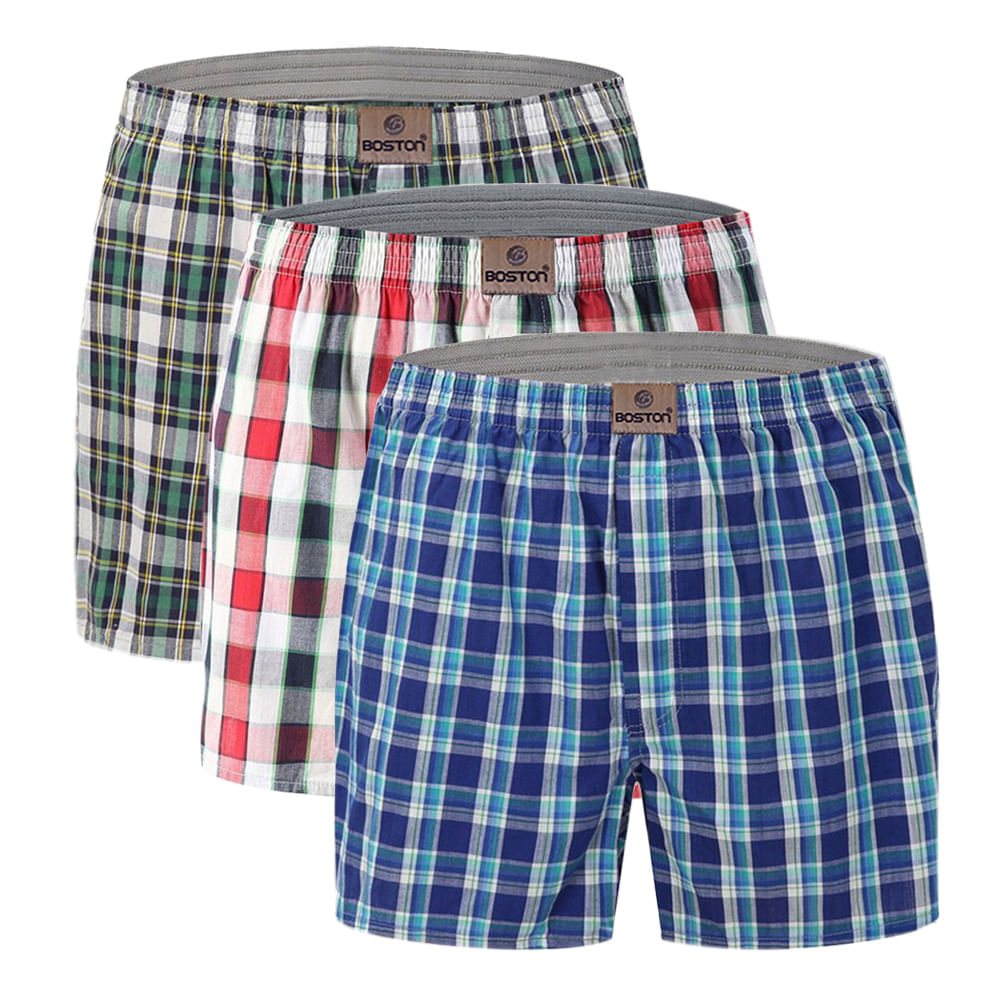 Pack x3 Bóxer Boston de Tela Plana con Diseño a Cuadros