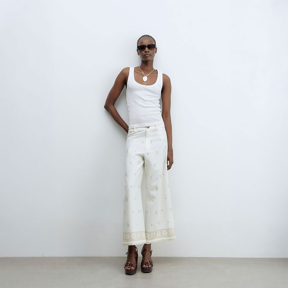 Pantalón Mujer Sfera Ancho Bordados Beige