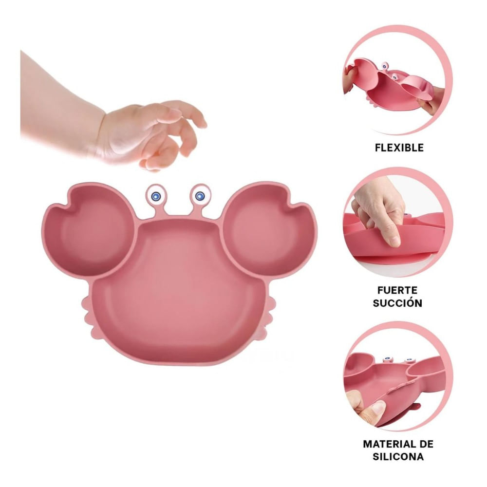 Plato Silicona Cangrejo Palo Rosa para Bebé 3 Divisiones