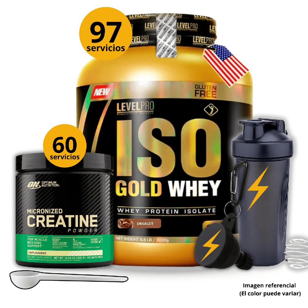 Proteína Iso gold whey de 3kg Chocolate - Creatina Optimum Nutrition de 300gr - regalos