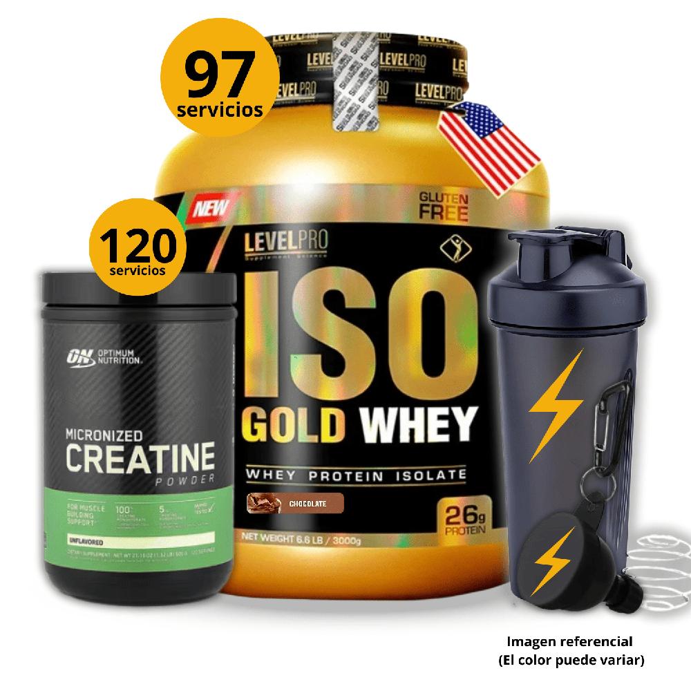 Proteína Iso gold whey de 3kg Chocolate - Creatina Optimum Nutrition de 600gr -regalos