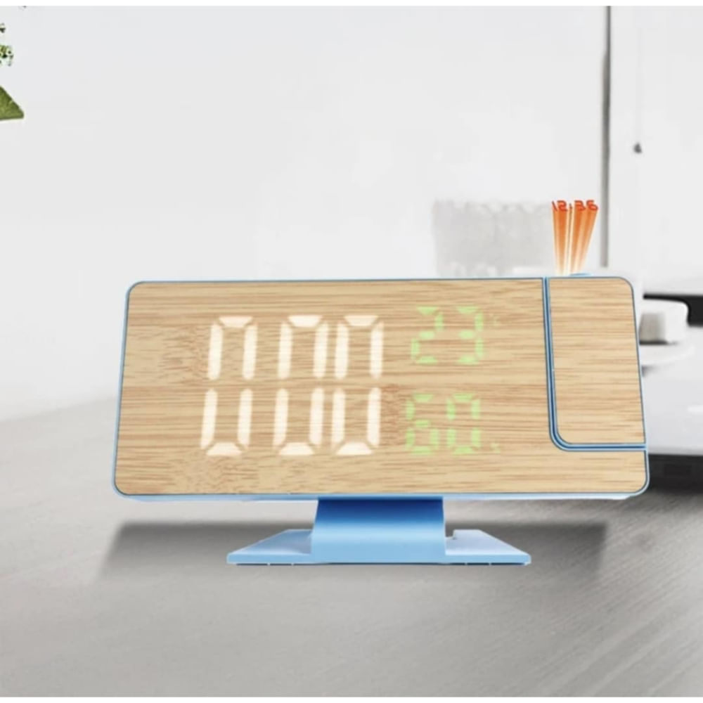 Reloj Digital Proyector Despertador de Hora Alarma Pantalla de Madera Celeste