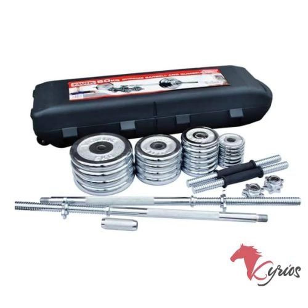 Set 50 Kilos Mancuernas Pesas Cromadas Maletin Y Barra Recta Plateado