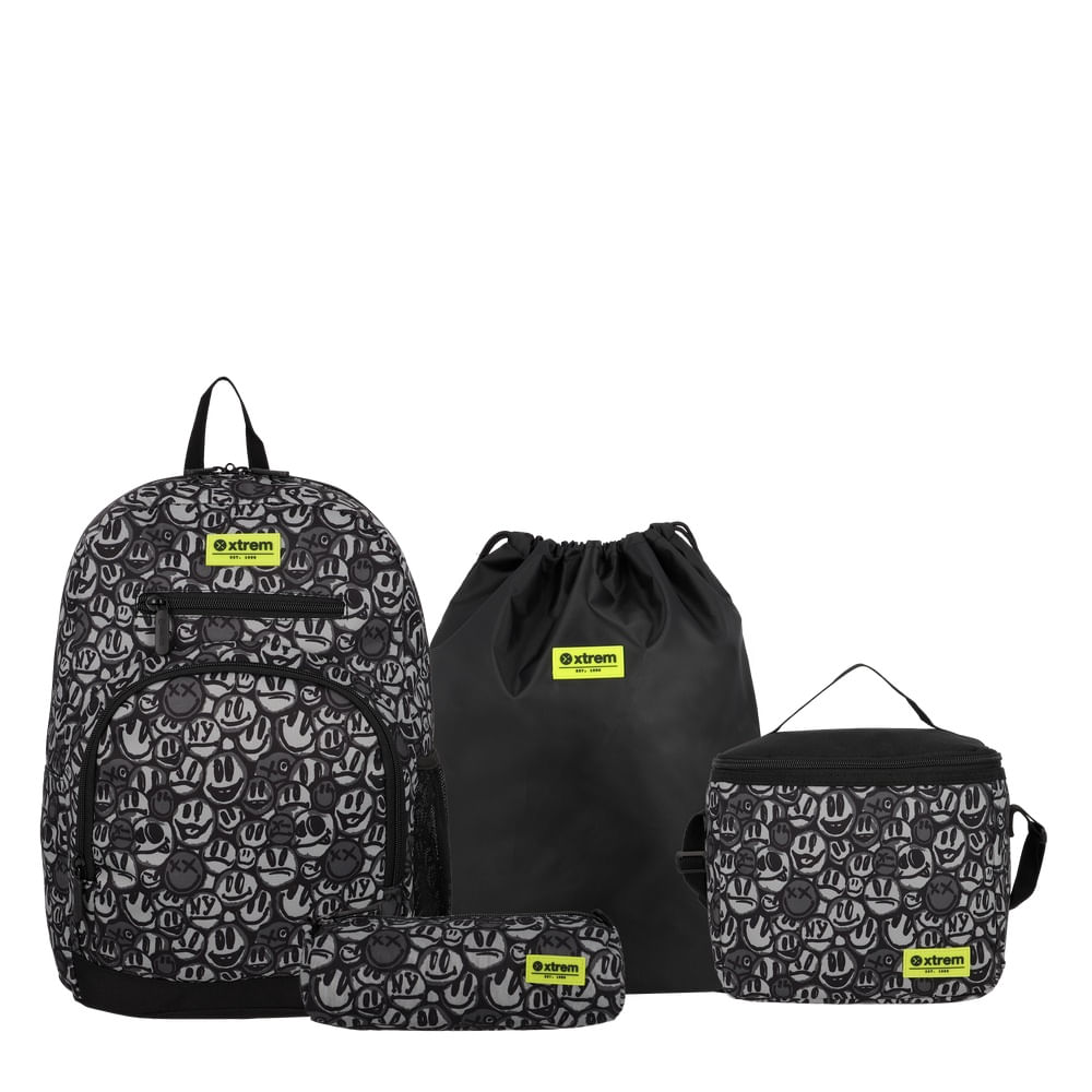 Set Mochila + Lonchera + Bolsa Con Cordón + Cartuchera Xtrem 6Xt Black Graffiti Print