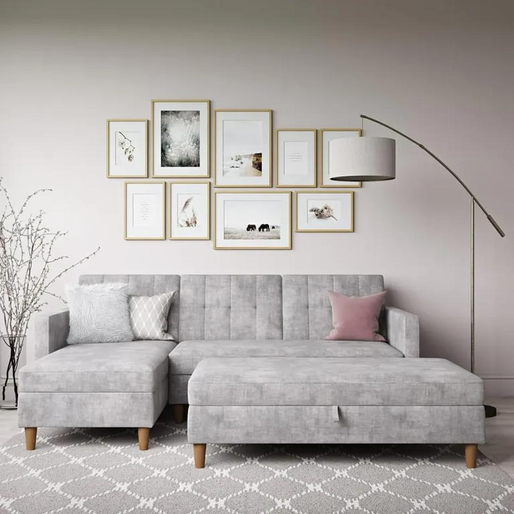 Sofá Seccional Hatford gris plata dos piezas más baúl