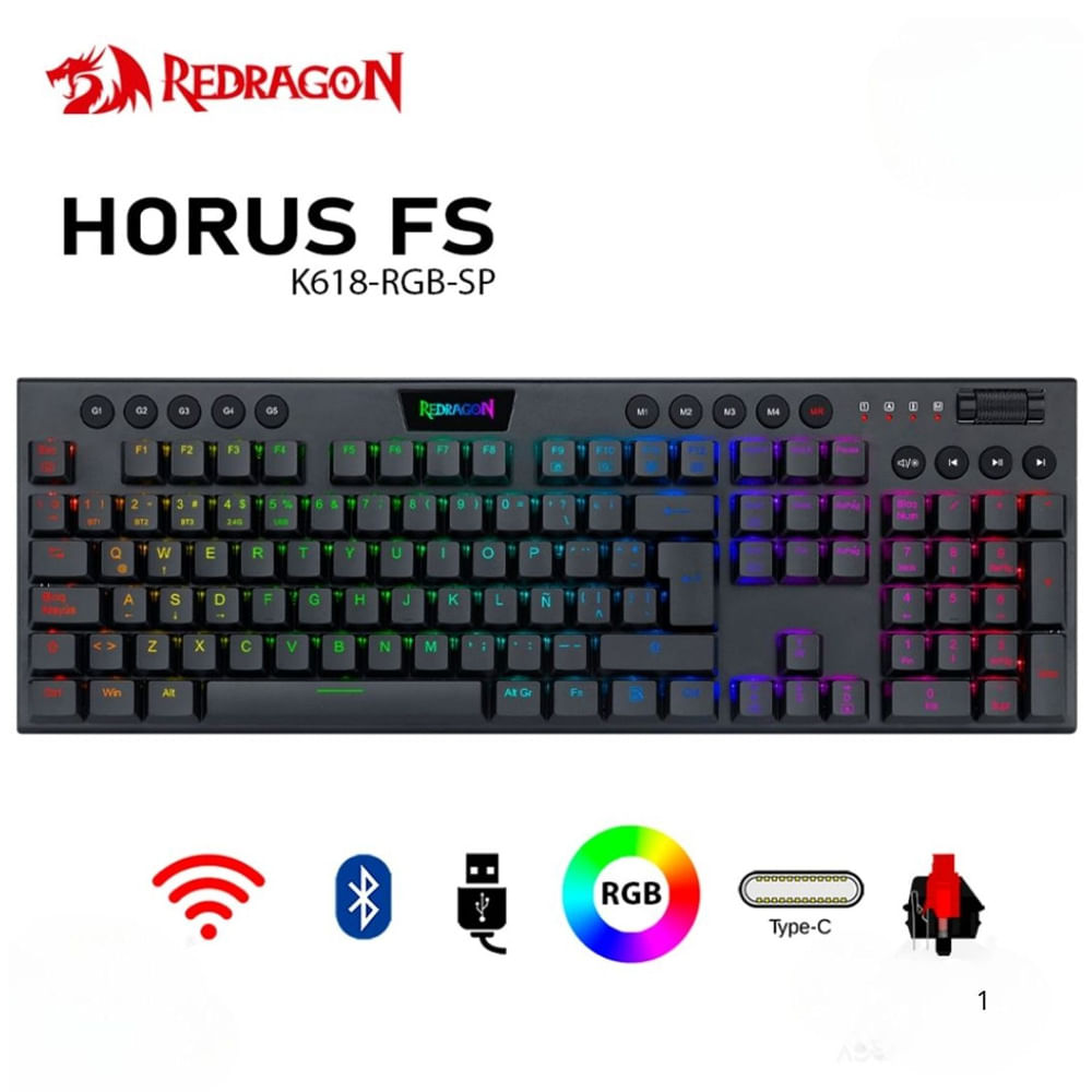 | Características | •TIPO TECLADO: Mecánicos Inalámbricos (Horus K618 RGB •TECLAS MULTIMEDIA: Si, dedicadas. •CONEXIÓ |