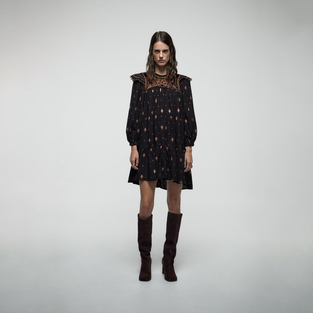 Vestido Corto Mujer Sfera Mini Pechera Bordados Negro