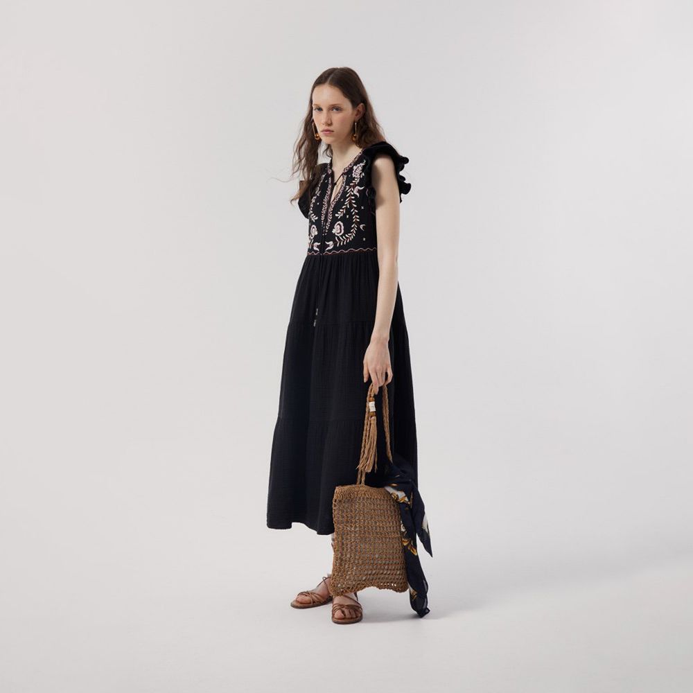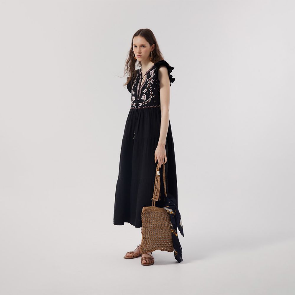 Vestido Mujer Sfera Bordado Pechera Negro