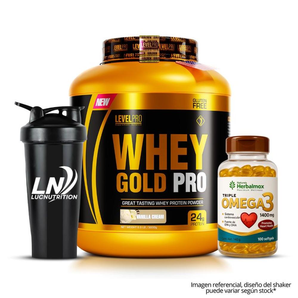 Whey Gold Pro 3 kg vainilla + omega 3 herbalmax 100 capsulas + shaker